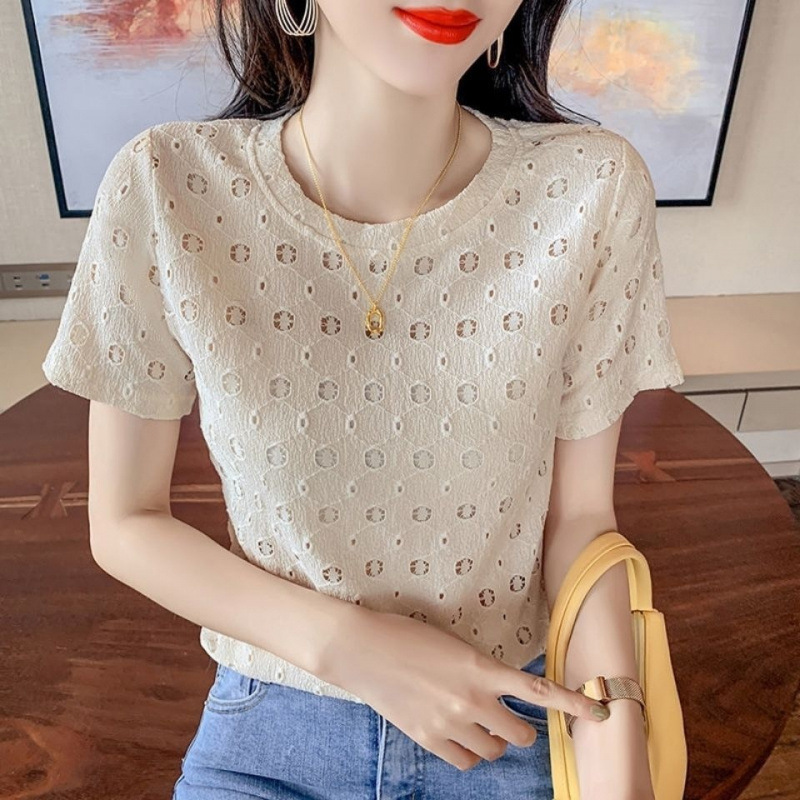 2024 夏中空新ファッションスリムラウンドネックニッチトップ気質多用途半袖 Tシャツレースシャツ女性のための