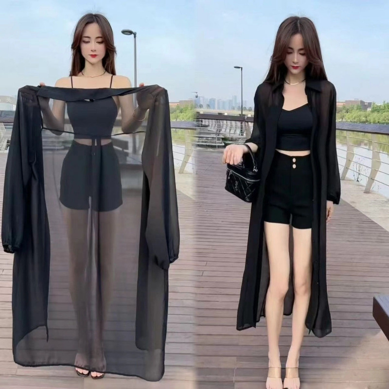 2025 夏の女性の韓国スタイルメッシュロング日焼け止めシャツ女性のカーディガンジャケットルーズ痩身長袖トップシフォン