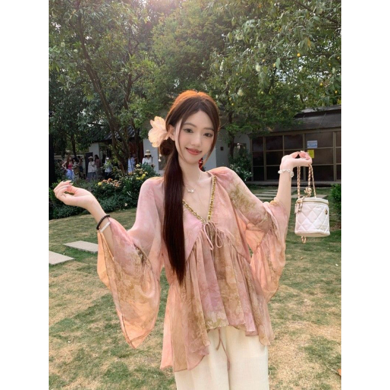 雰囲気のある花柄長袖シフォンシャツ女性用2025春夏新作韓国Vネックデザイン薄手日焼け止めトップ