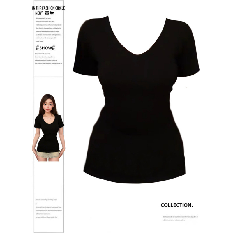 プラスサイズファットmm春夏スリムドレープ右肩ウエストVネック半袖トップスレディースボトムベーシックホットガールTシャツ