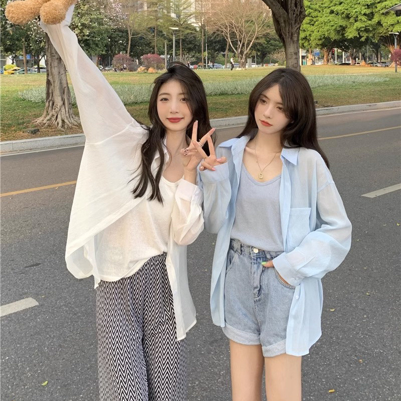 2025 新韓国スタイルルーズカジュアルミッドレングス薄手シャツアウタードレープ無地シャツ長袖日焼け止めシャツ