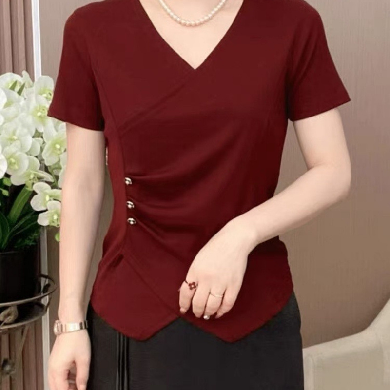 2025 新しい夏の半袖 T シャツ、ファッショナブルな無地の気質、多用途、スタイリッシュでスリムな不規則なトップス、新しい中国風