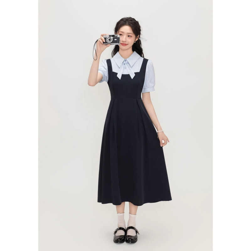 カレッジスタイルのリボン半袖ドレス女性のための 2025 夏の新しいフォレストスタイルの偽ツーピースウエストシャツドレス
