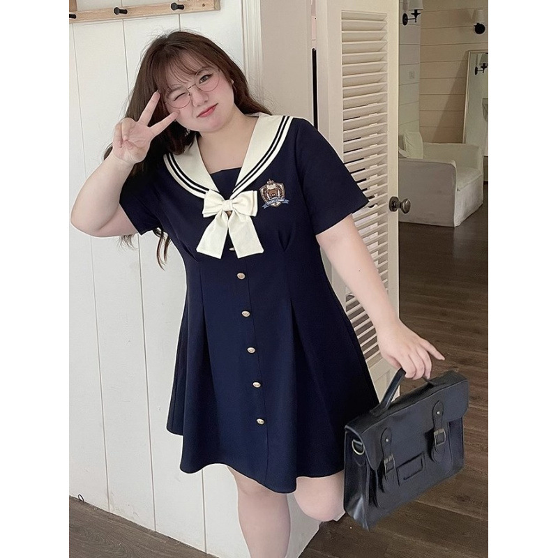 プラスサイズファットmmネイビーカラーフレンチスタイル新しいスリムカレッジスタイルドレス夏のリボン気質Aラインスカート女性用