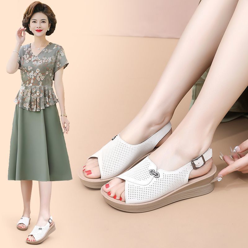 夏用本革マザーズサンダル、バックルストラップ、中年魚口サンダル、ミッドヒール、厚底、多用途で快適なオープントゥ婦人靴