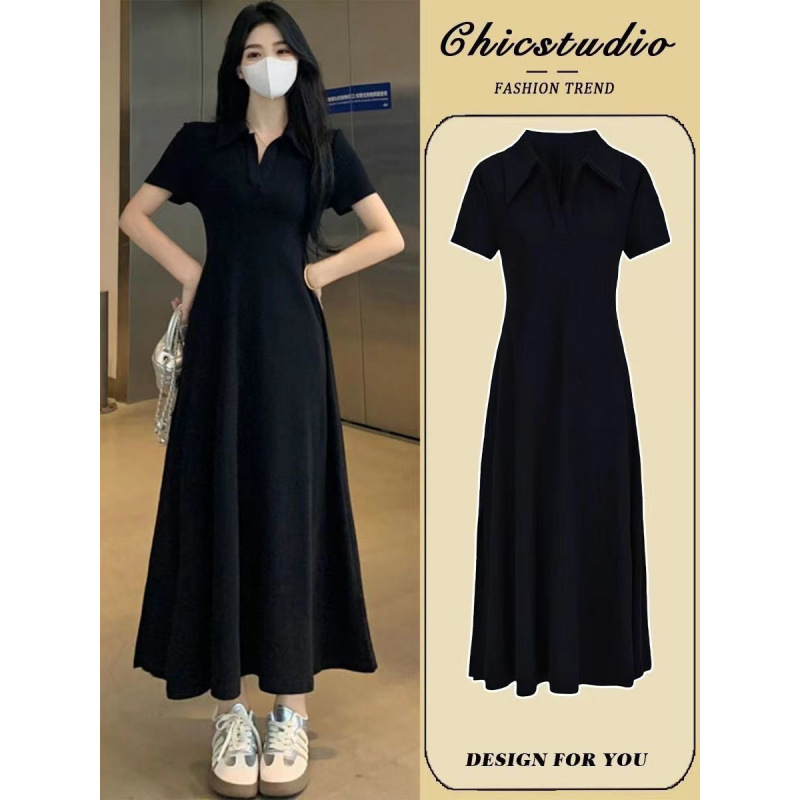 女性のためのフランスのハイエンド半袖ドレス夏のウエスト痩身黒のロングスカートデザイン右肩ポロカラースカート