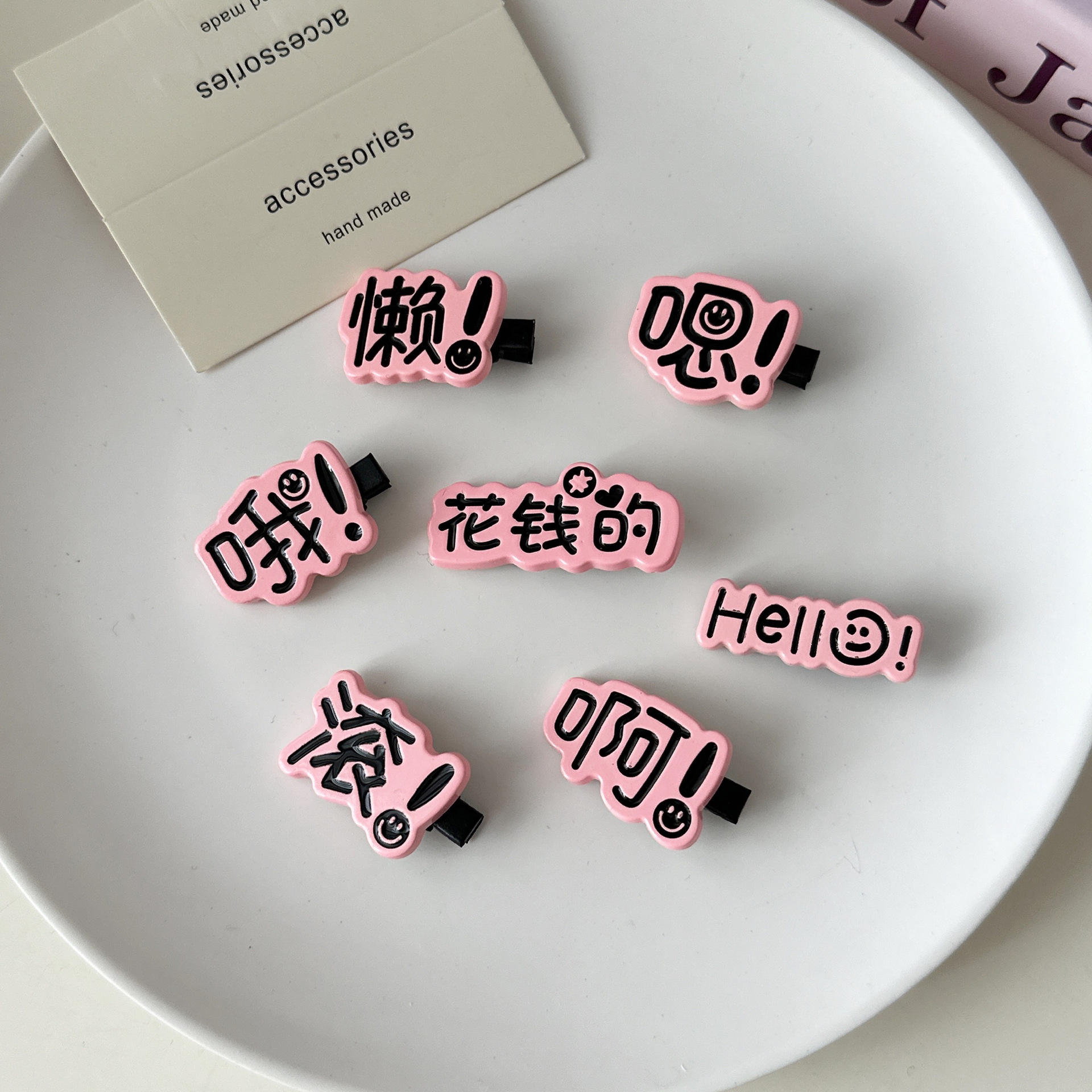 趣味は、クリエイティブな文字ヘアピンの女性がかわいい個性的な学生カモの口の横の前髪のカードの新製品です。