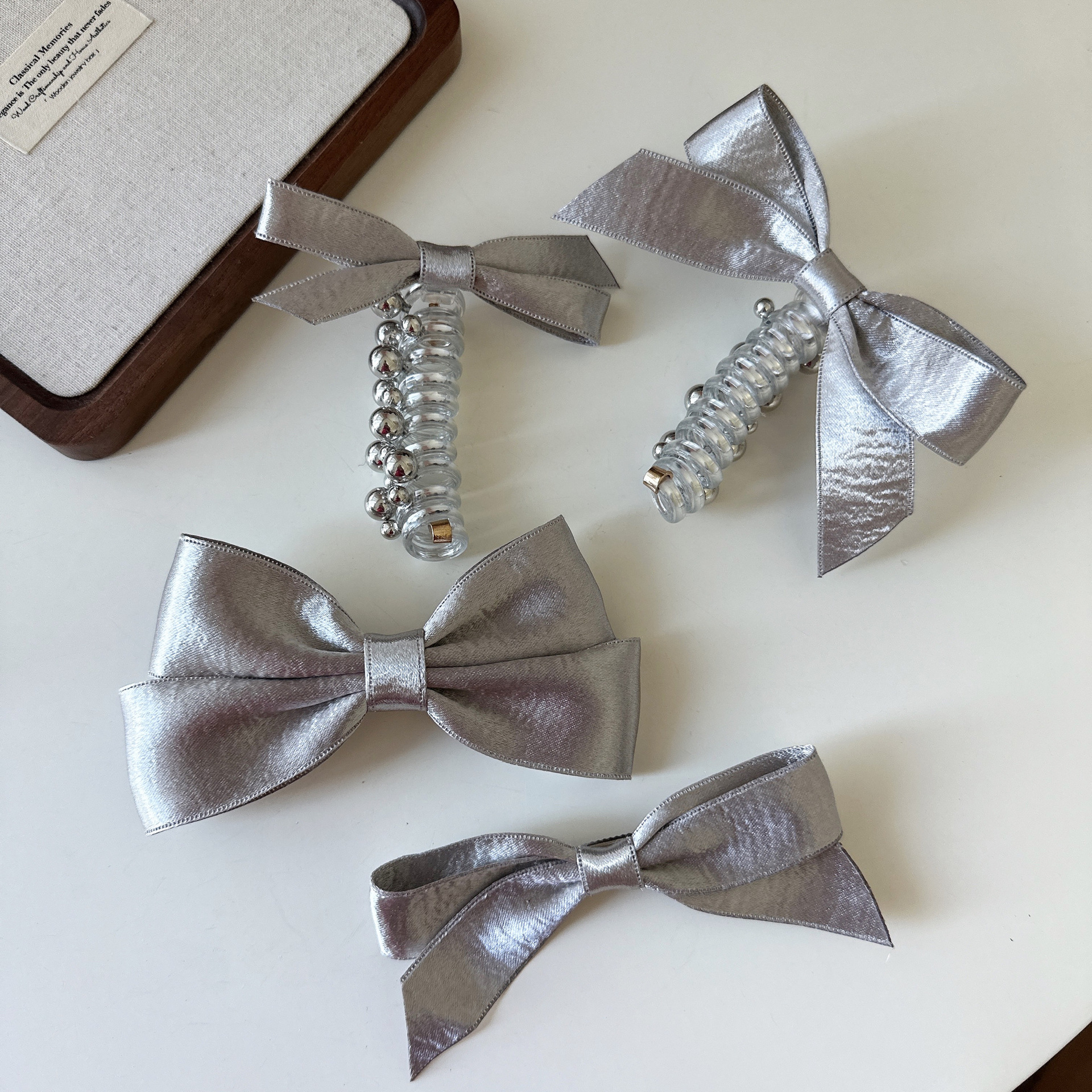 甘いクールな少女の銀色の蝶結びのヘアピンの電話線のヘアピンの経典の百合の高い馬尾の泡の下げの髪のひも