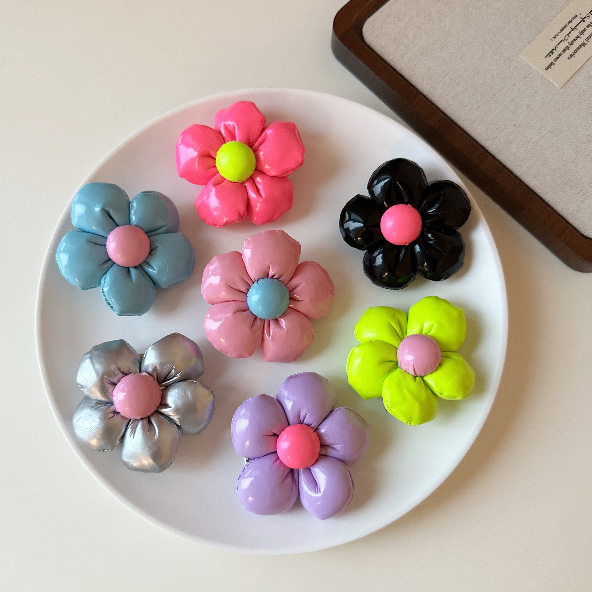 かわいいキャンディー色の手作りの革の花のヘアピンの少女の前髪は双馬尾のヘアピンを挟みます。