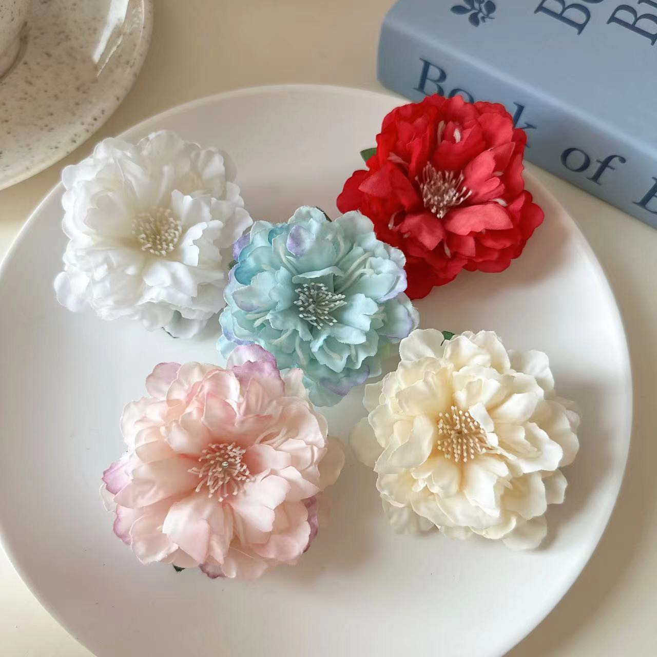 ぼかし染めの青いツバキの花のヘアピン春夏の甘くて清新感があります。