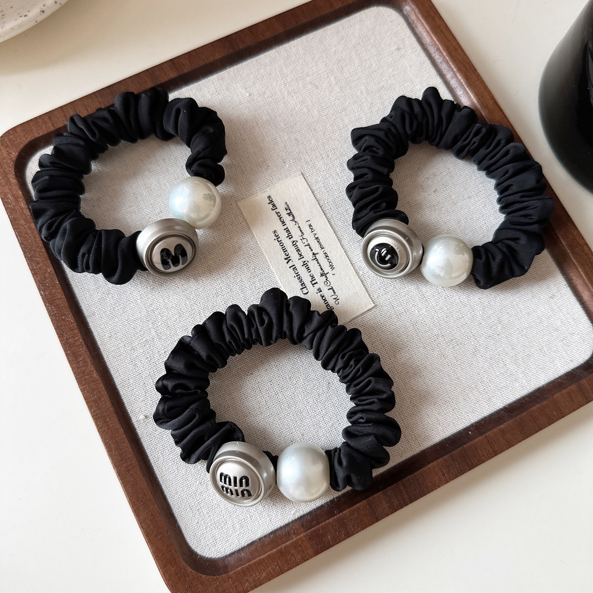 レトロな黒色の高級感のアルファベットの笑顔の金属の部品は真珠のシュシュをプラスして髪を傷つけません。