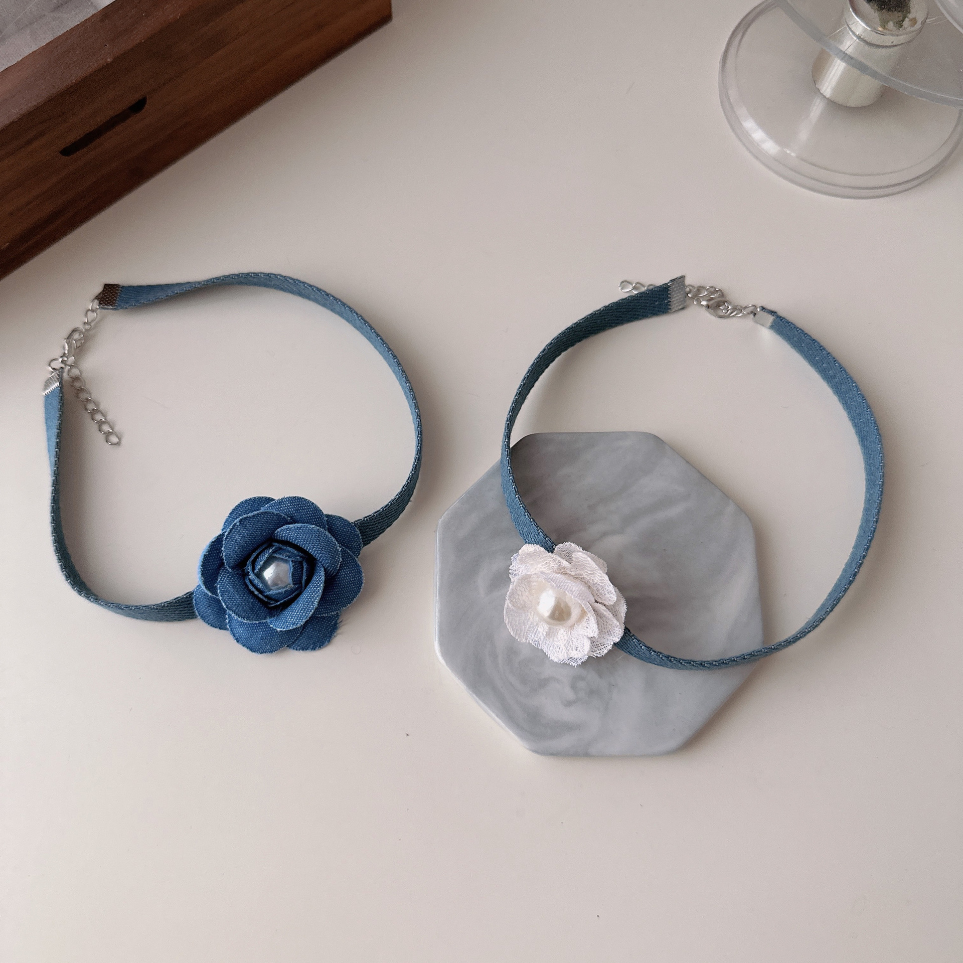 レトロなブルーの小清新で甘い真珠のツバキの花のネックレスの鎖の鎖のchokerのバンドの優しい純粋な欲の首のバンド