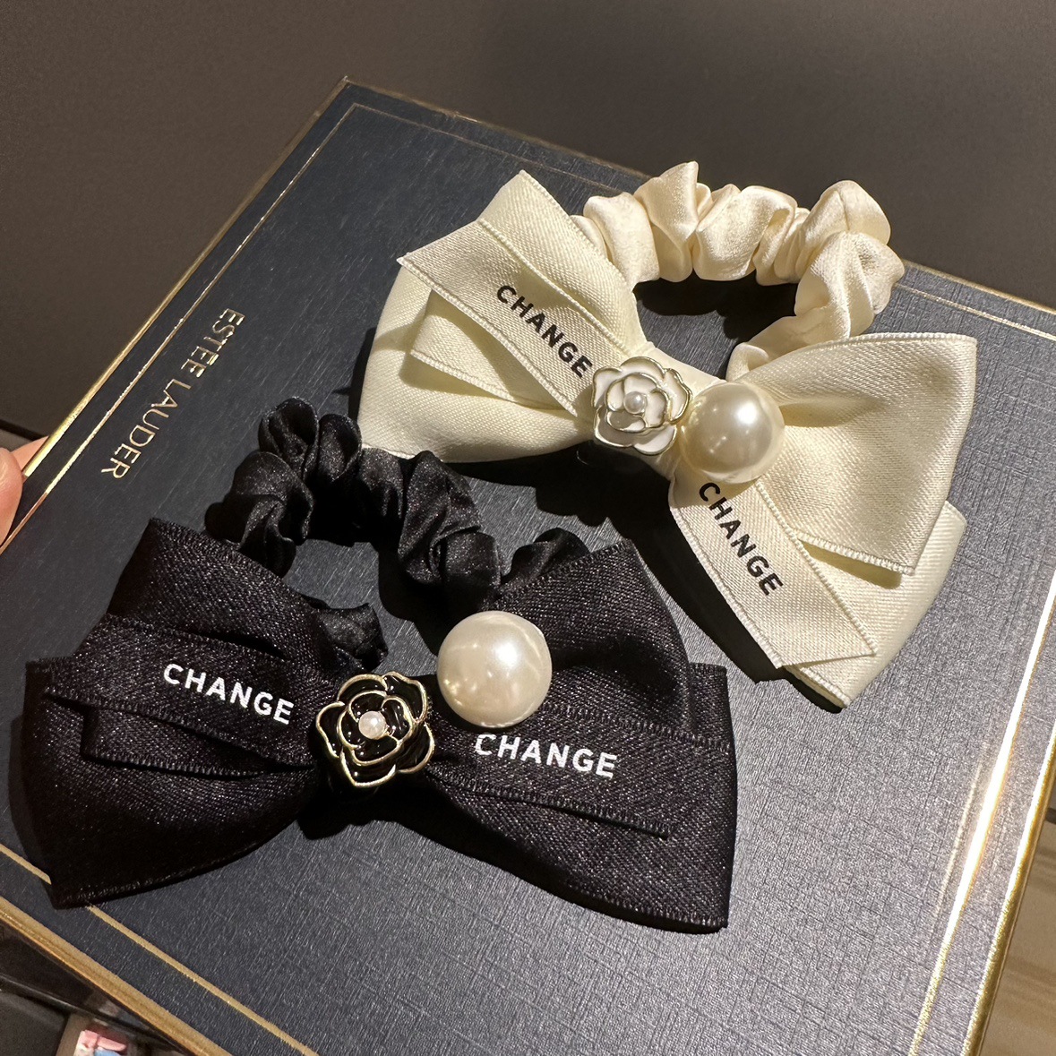 韓国の小香風真珠ツバキの花の蝶結びの髪の輪の高い馬尾の紐の皮の筋の高級感は髪の毛の紐を刺します。