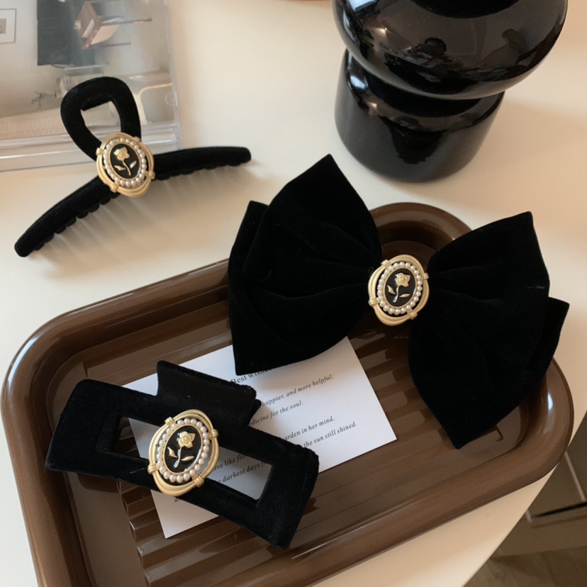 富家千金高級感黒いベルベットのバラのリボンのヘアピン