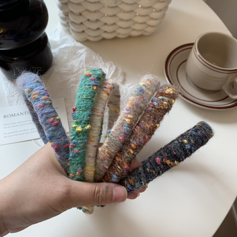 秋冬の新作カラー毛糸は手でカチューシャを巻いています。