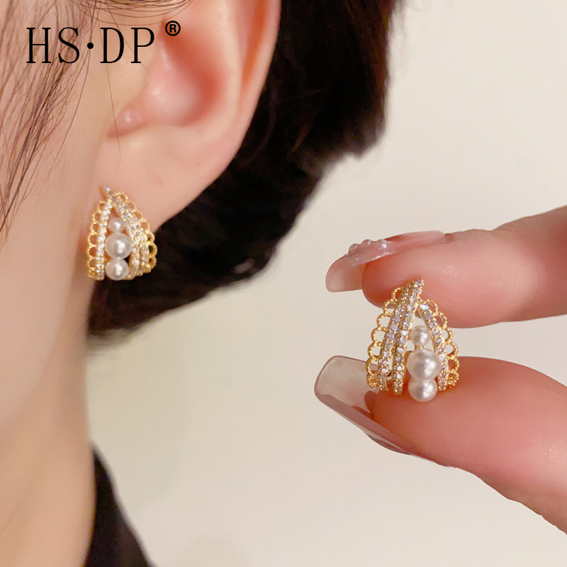 ネット赤ファッション軽贅沢高級感満ドリル三角真珠耳ボタン女性大衆シンプルデザイン感イヤリング卸売り