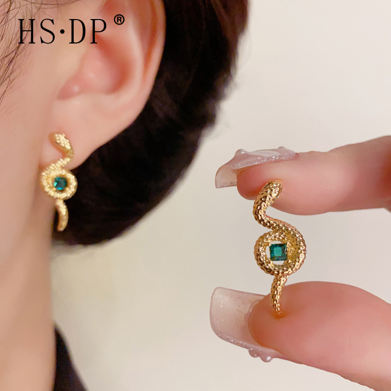 大衆ファッションデザイン感金属蛇の形に緑のダイヤを巻いた個性シンプルで独特な高級感のあるイヤリング