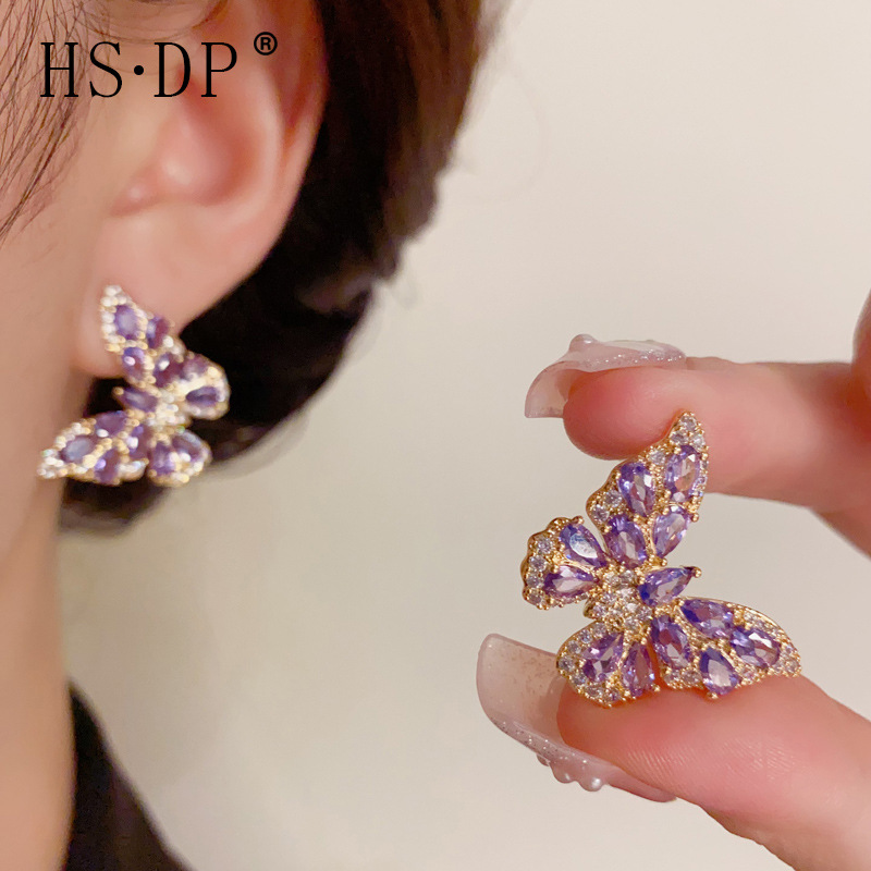 小型ジルコン金属伸線蝶ピアスs925銀針小衆気質ファッション百合高級イヤリング卸売り