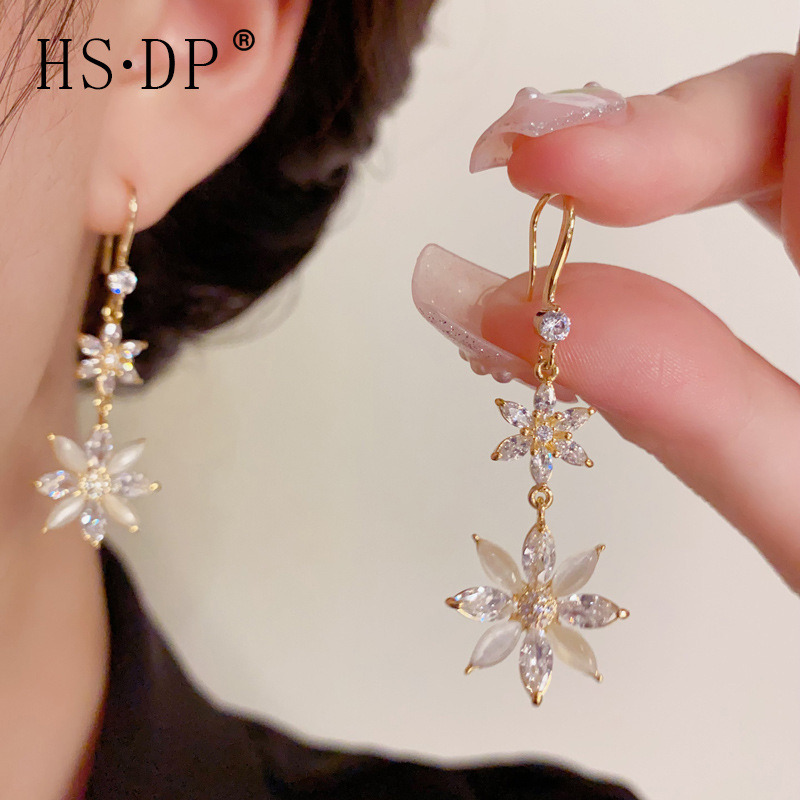韓国式の軽い豪華な高級感の超フラッシュジルコンの太陽の花のフリンジの耳のフックの精巧なファッションの百合の長いタイプのイヤリングの卸売り
