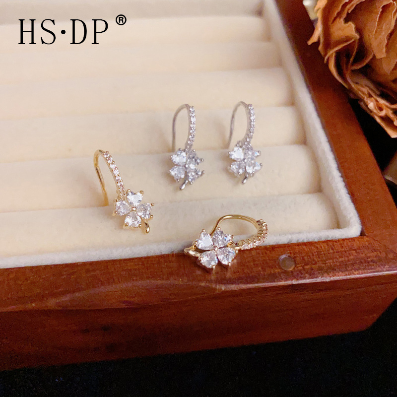 夏の新しい多用途超光沢のあるフルダイヤモンド四つ葉の花の小さなイヤーフック女性の絶妙な軽い高級シンプルなデザインのイヤリング卸売