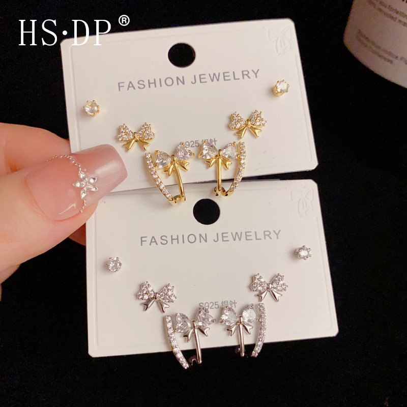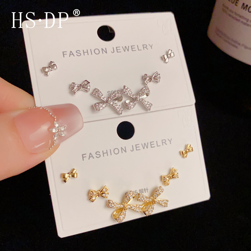 s925 シルバー針ファッショナブルで絶妙な多用途フルダイヤモンドリボン 3 点セットイヤリング毎日の通勤コンパクトイヤリング卸売