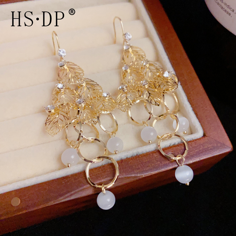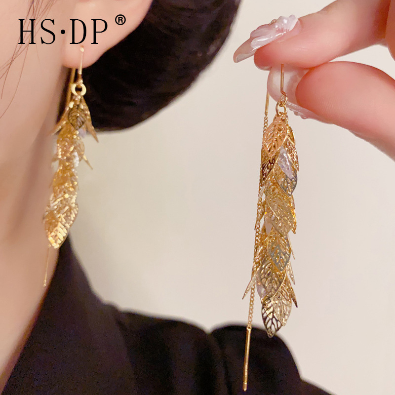 夏の新しいスタイルのファッショナブルな金属中空葉タッセルイヤリングライト高級シンプルなロングスリムイヤリング卸売