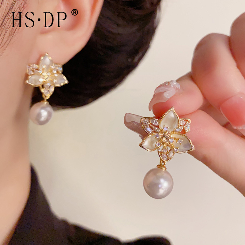 s925 シルバー針ライト高級ファッション優しく多用途ダイヤモンド象嵌花びらパールイヤリング女性ニッチシンプルなデザインイヤリング