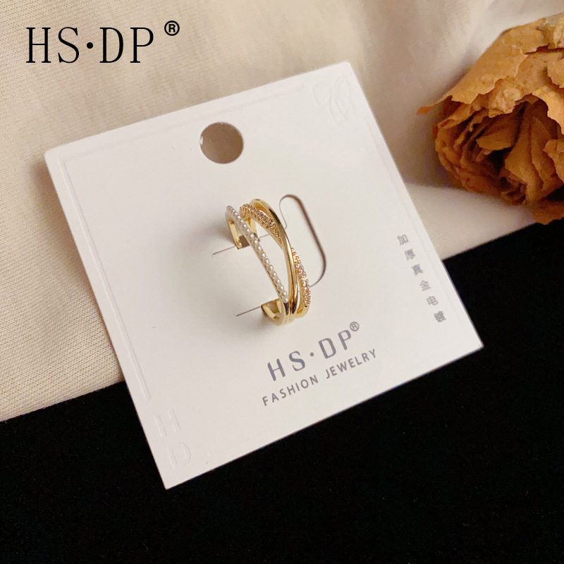 夏の新しいシンプルなデザインのパールとダイヤモンドの二層クロスリング、パーソナライズされた軽い高級感と多用途のオープンリング卸売