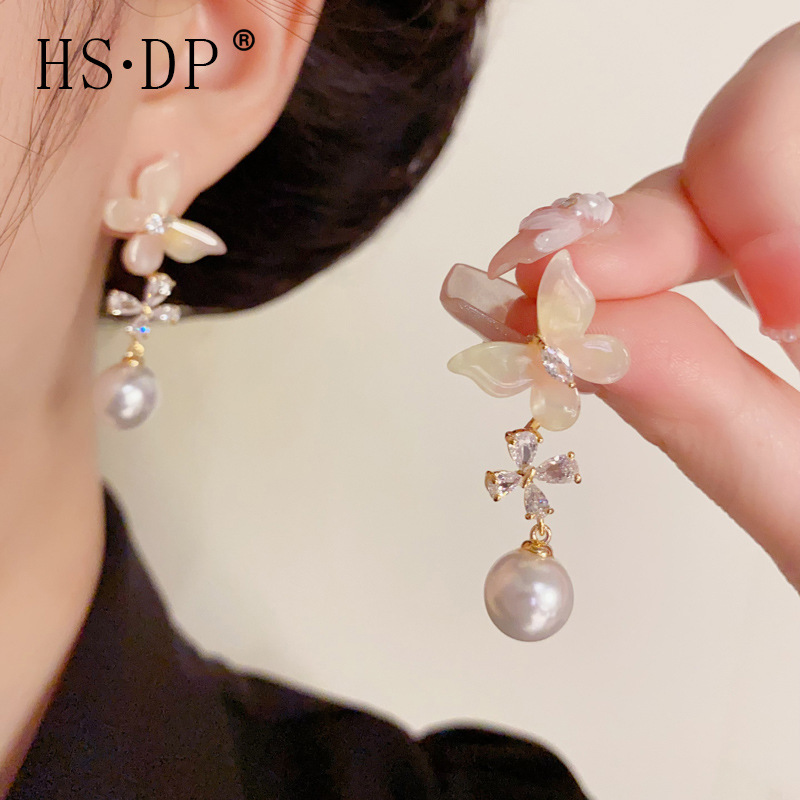 小さな新鮮でファッショナブルな樹脂象嵌ダイヤモンド蝶真珠タッセルイヤリング、軽い高級感、優しく多用途、高品質のイヤリング卸売