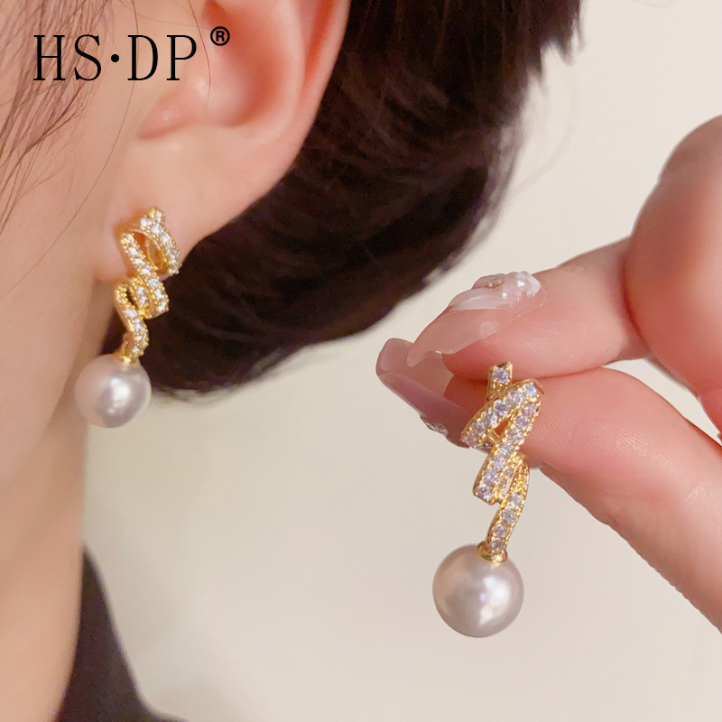 s925 シルバー針気質ファッショナブルなフルダイヤモンドツイストパールイヤリング絶妙なライト高級シンプルな多用途スーパーフラッシュイヤリング卸売