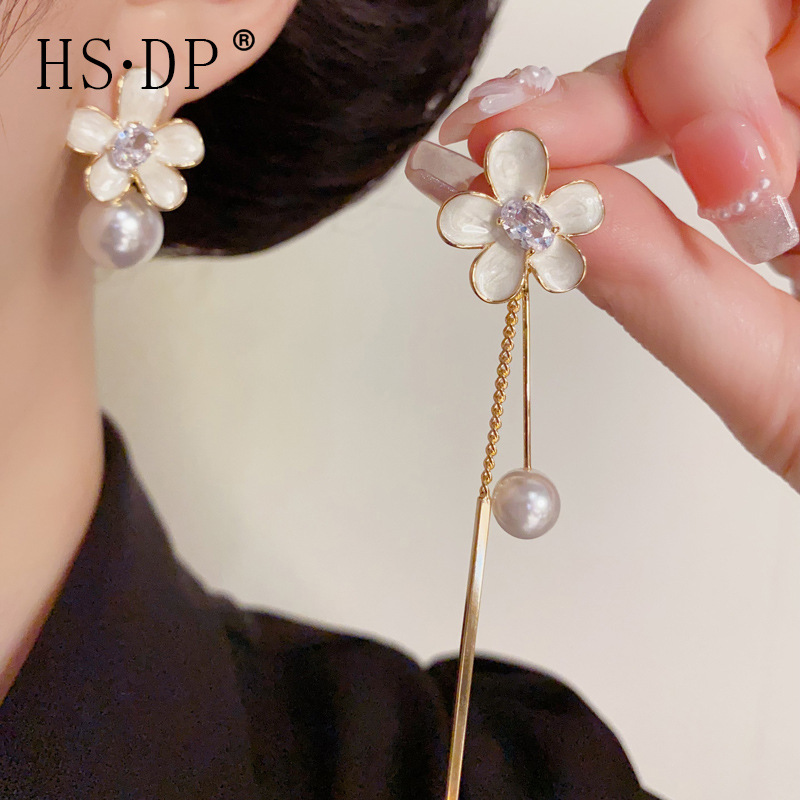 夏の新しいファッションデザイン非対称フラワーパールタッセルイヤリングライトラグジュアリー甘い多用途ロングイヤリング