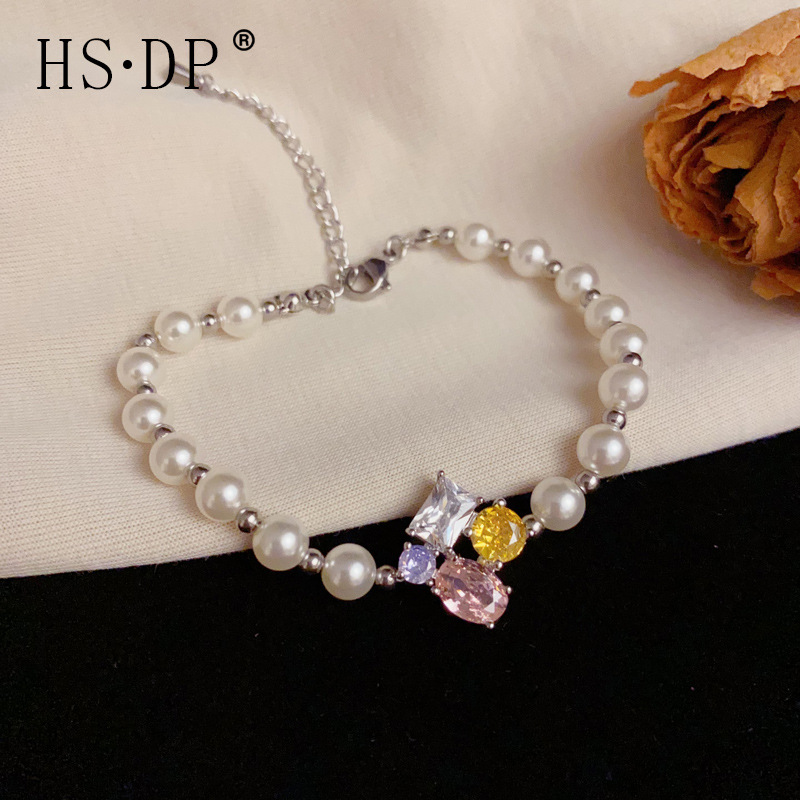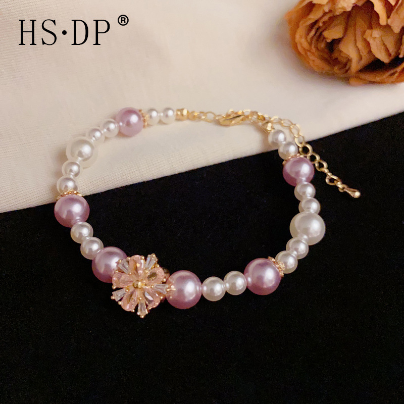 ライトラグジュアリーファッションエレガントで多用途なコントラストカラーパールクリスタルフラワーブレスレットフェミニンシンプルなデザインのハンドジュエリー卸売