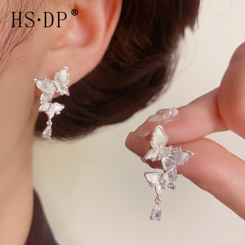 フレンチライトラグジュアリーファッション多用途スーパーフェアリー厚いシルバー薄いコーティングされたダイヤモンドバタフライタッセルイヤリングニッチデザインイヤリング