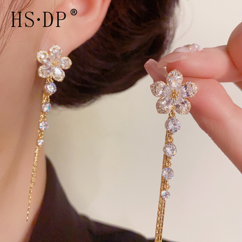 夏の新しい多用途の超光沢のあるフルジルコニウムフラワーロングタッセルイヤリング女性用、絶妙でファッショナブルでハイエンドのイヤリング卸売