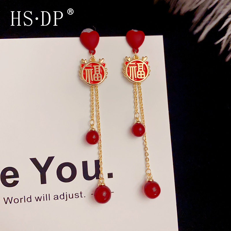 2024年秋冬新作おめでたい愛の福の字のフリンジのイヤリングの高級感の新年の気質のファッションネットの赤いイヤリング