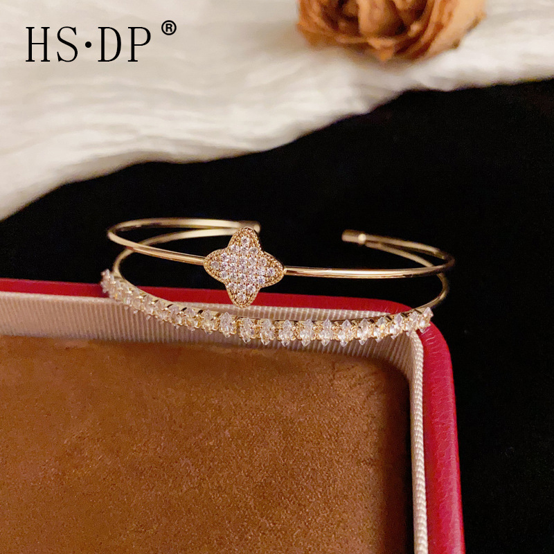 夏の新しいファッションクロスボーダーフルダイヤモンド四つ葉の花二層オープンブレスレット気質多用途デザインブレスレット卸売