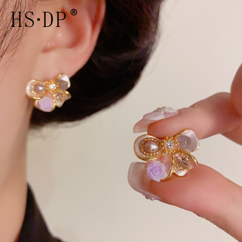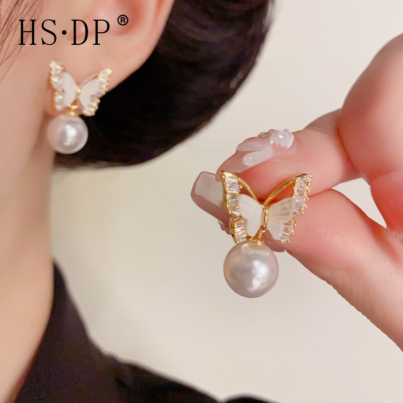 フレンチライトラグジュアリー多用途ダイヤモンドバタフライパールイヤリング女性用、絶妙でファッショナブルでシンプルなデザイン、超光沢のあるイヤリング卸売