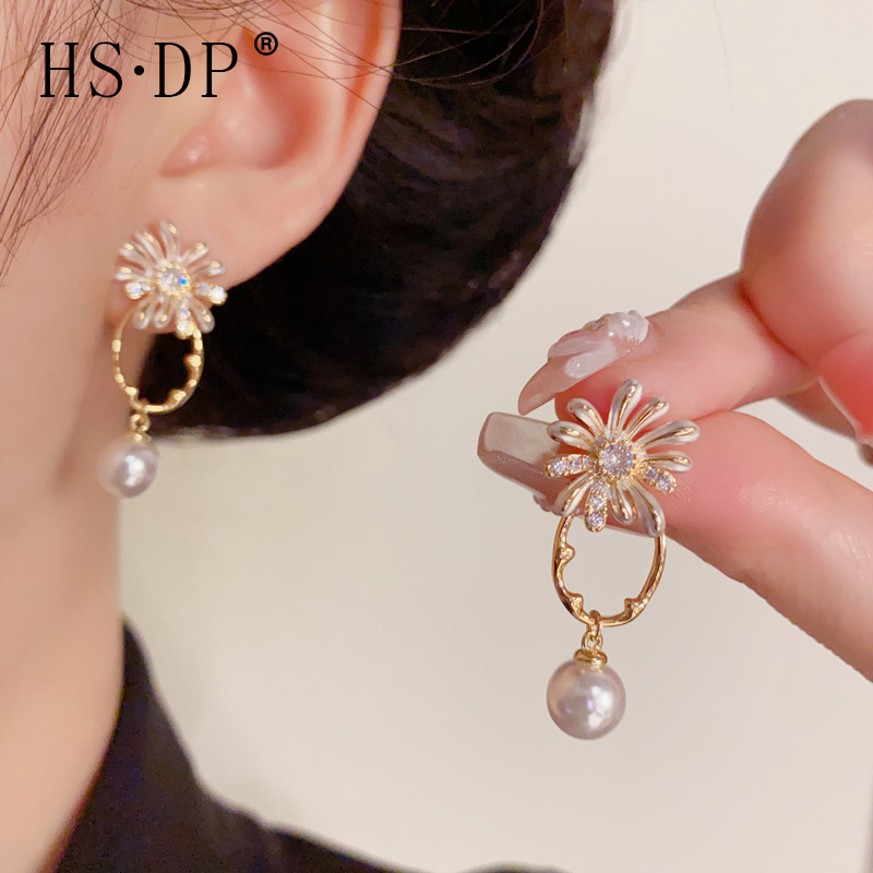 s925 シルバー針ファッショナブルなシンプルなデザインの小さなデイジー幾何学的なパールイヤリング気質ライト高級甘い多用途イヤリング