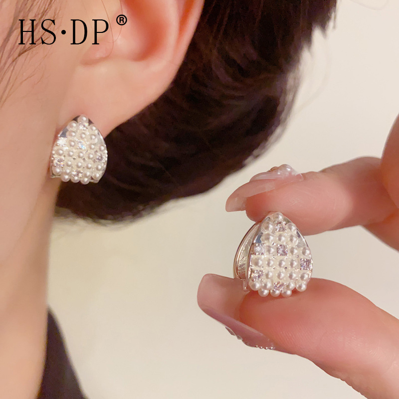 夏の新しいファッション厚いシルバーフルダイヤモンドパール三角形イヤリングパーソナライズされたライト高級多用途デザインイヤリング卸売
