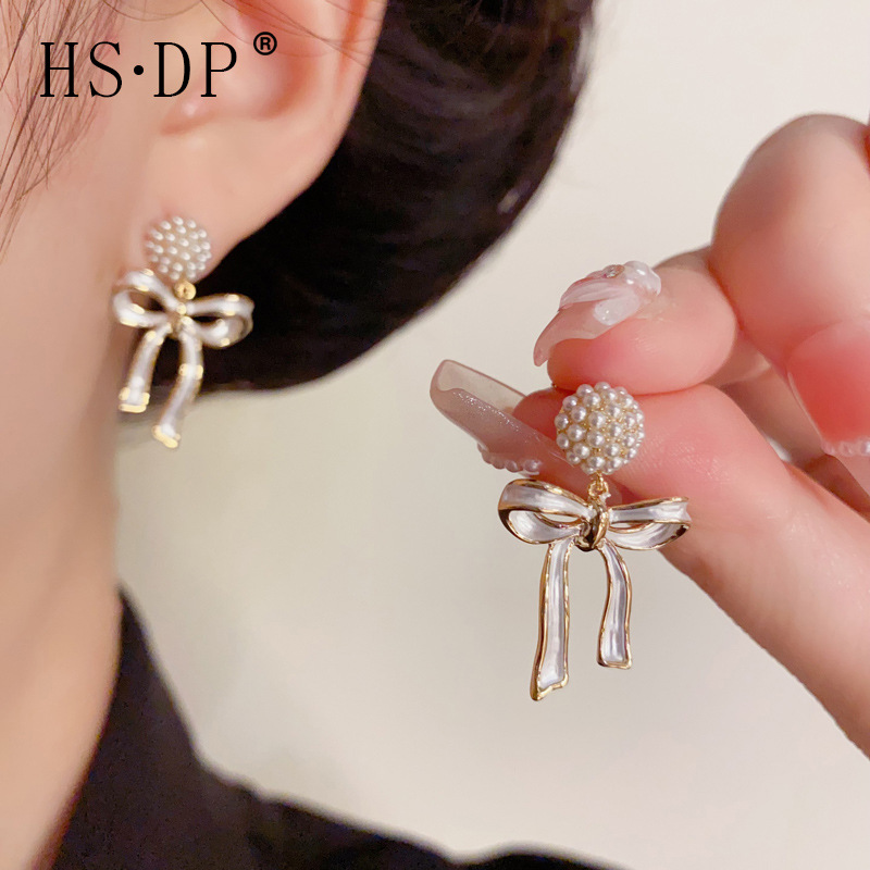夏の新しいスタイル、優しくて多用途なパールボールリボンイヤリング、ファッショナブルで軽い高級デザインイヤリング