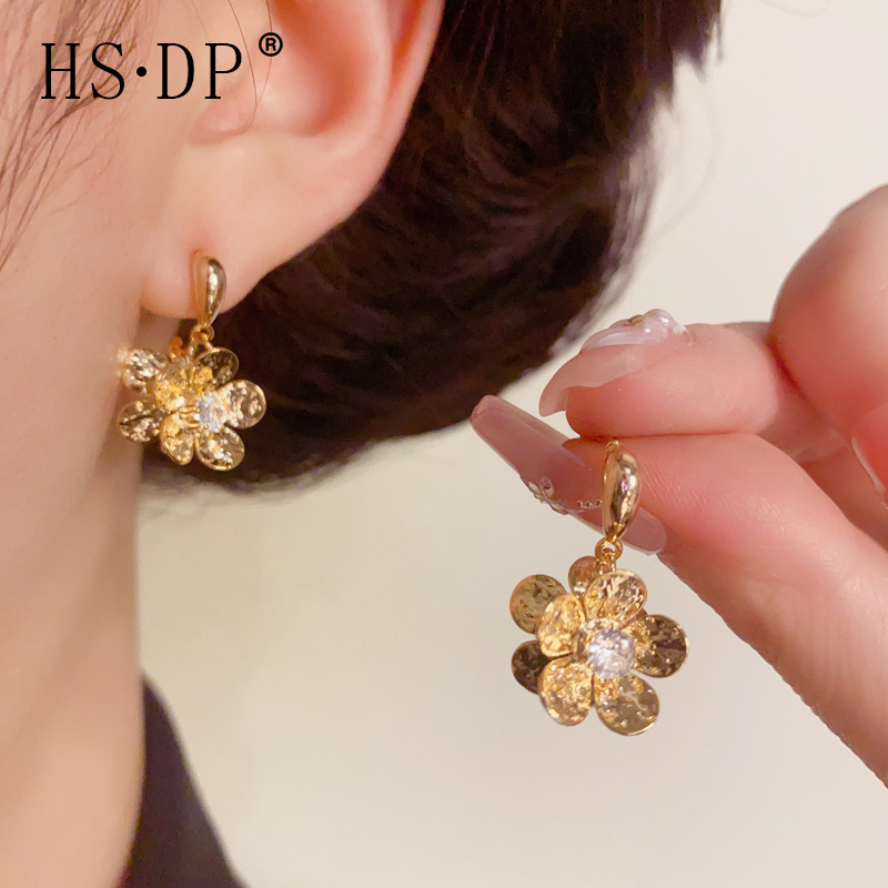 夏の新しいシンプルなデザインのメタル両面フラワーイヤリング、パーソナライズされた軽い高級感、多用途の高品質イヤリング卸売