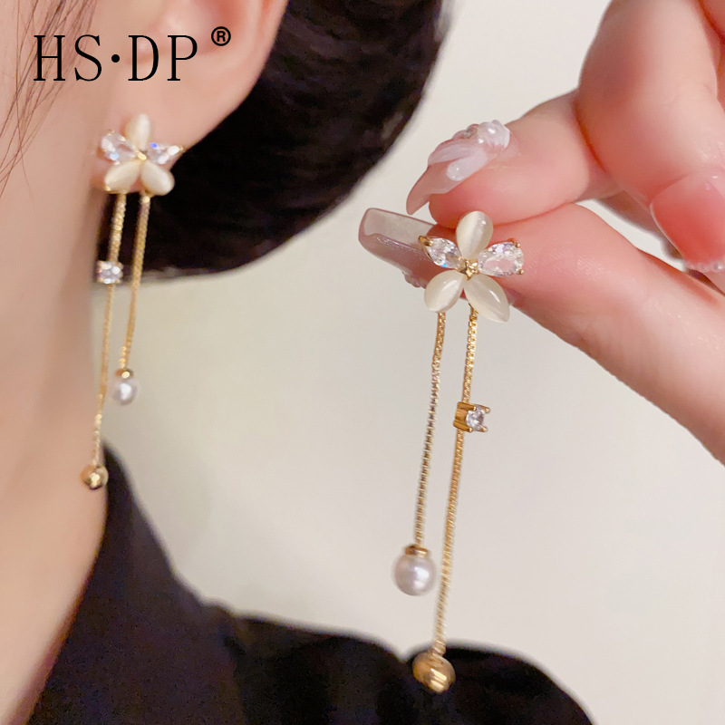 s925 シルバー針気質ファッショナブルなスーパーフラッシュダイヤモンドフラワーパールタッセルイヤリングライトラグジュアリースイート多用途スリムイヤリング