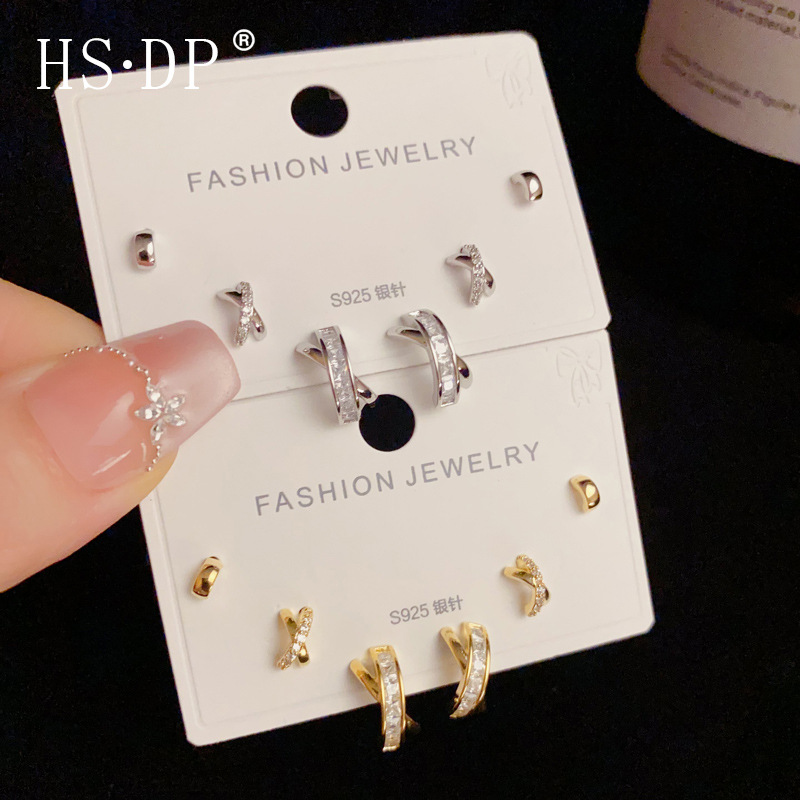 s925 シルバー針ファッションデザインダイヤモンドクロス 3 ピースイヤリングセット気質シンプルで多用途の通勤イヤリング卸売