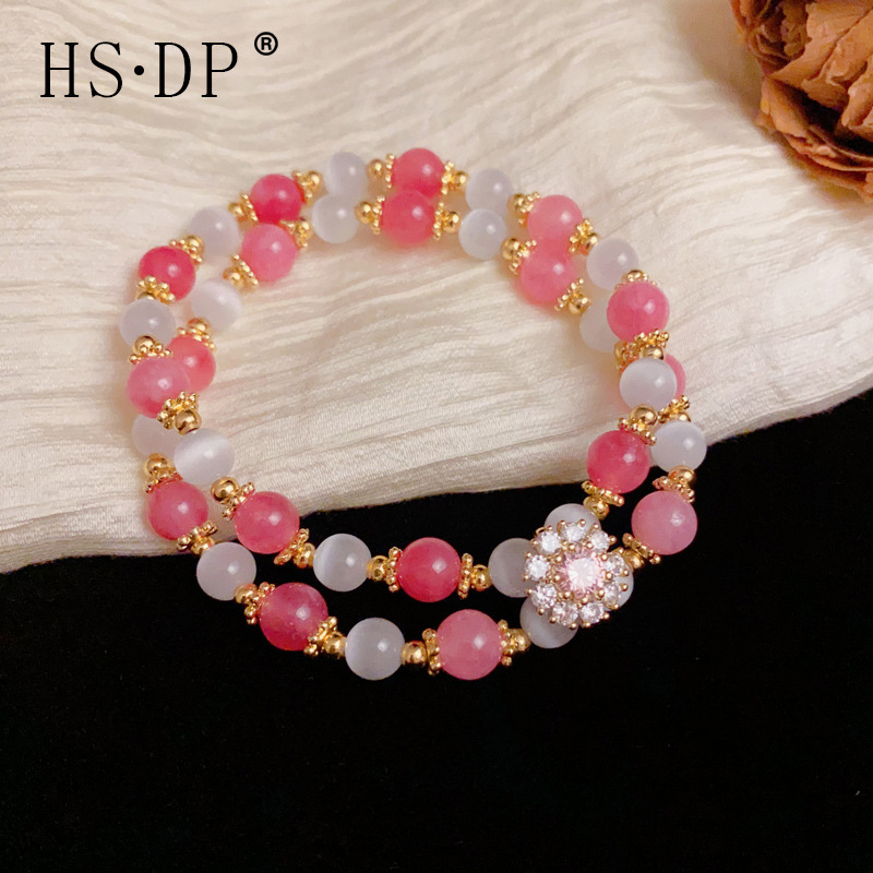 夏の新しいスタイルの軽い高級感、優しく多用途な瑪瑙ビーズキャッツアイストーン二層ビーズブレスレット、ファッショナブルでシンプルなブレスレット