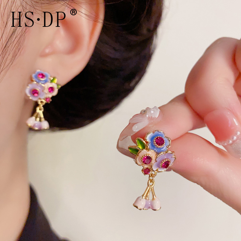 s925 シルバー針ファッション小さな新鮮なカラフルなオイルドリップフラワータッセルイヤリングライトラグジュアリー甘い多用途デザインイヤリング