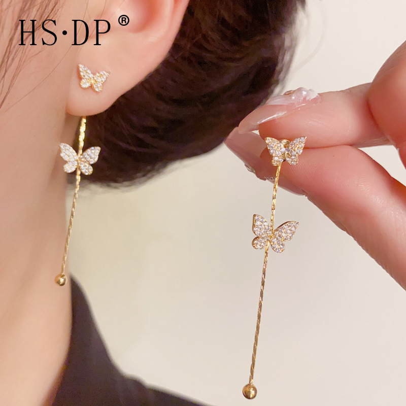 韓国風デザイン、ダイヤモンドがちりばめられた蝶のフロントとバックのタッセルイヤリング、女性用、絶妙で軽い高級感、多用途、高品質のイヤリング卸売