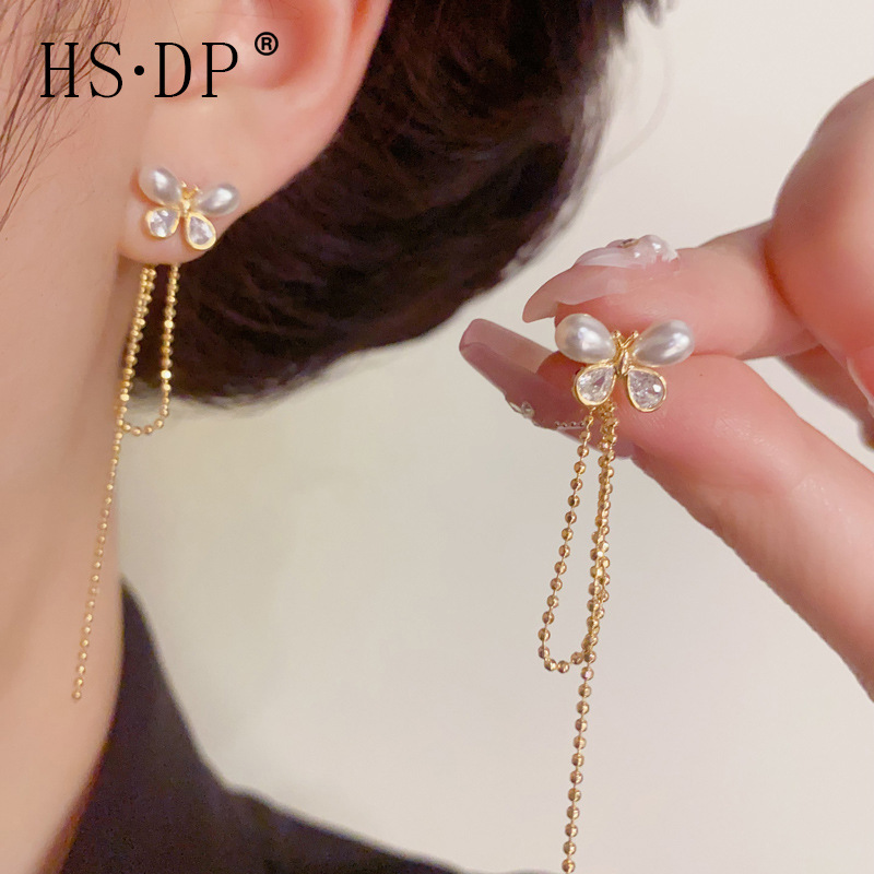 ニッチなファッションデザインのパールバタフライツーピースタッセルイヤリング、多用途でスリムな女性用S925シルバーニードルイヤリング