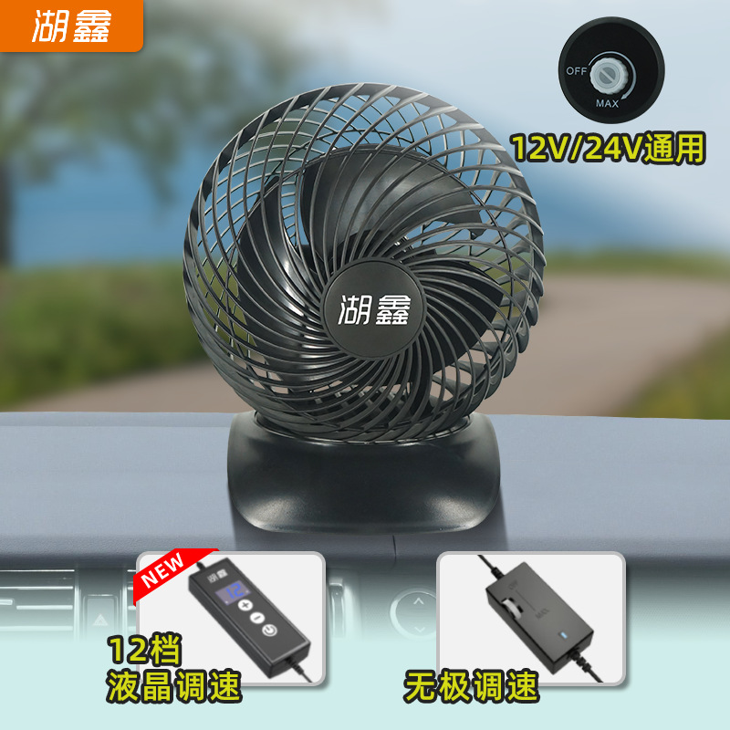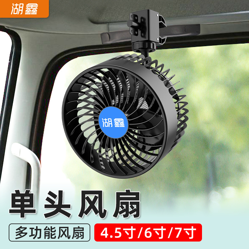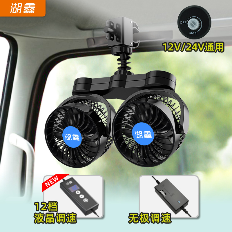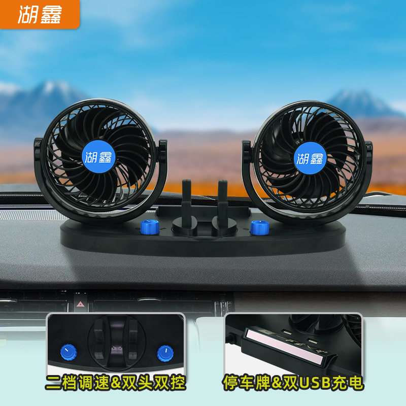 湖鑫新型usb両面静音12v 24v車載ファンハイパワーツイン360度回転トラッククリップ