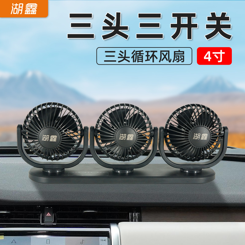 湖鑫三頭三制御車載冷却ファン、360度回転、ポータブル、3段階速度調整