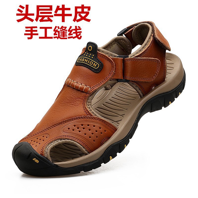 新しい夏のサンダル男性本革包頭ビーチ靴牛革滑り止め屋外通気性百合日常カジュアル男性靴